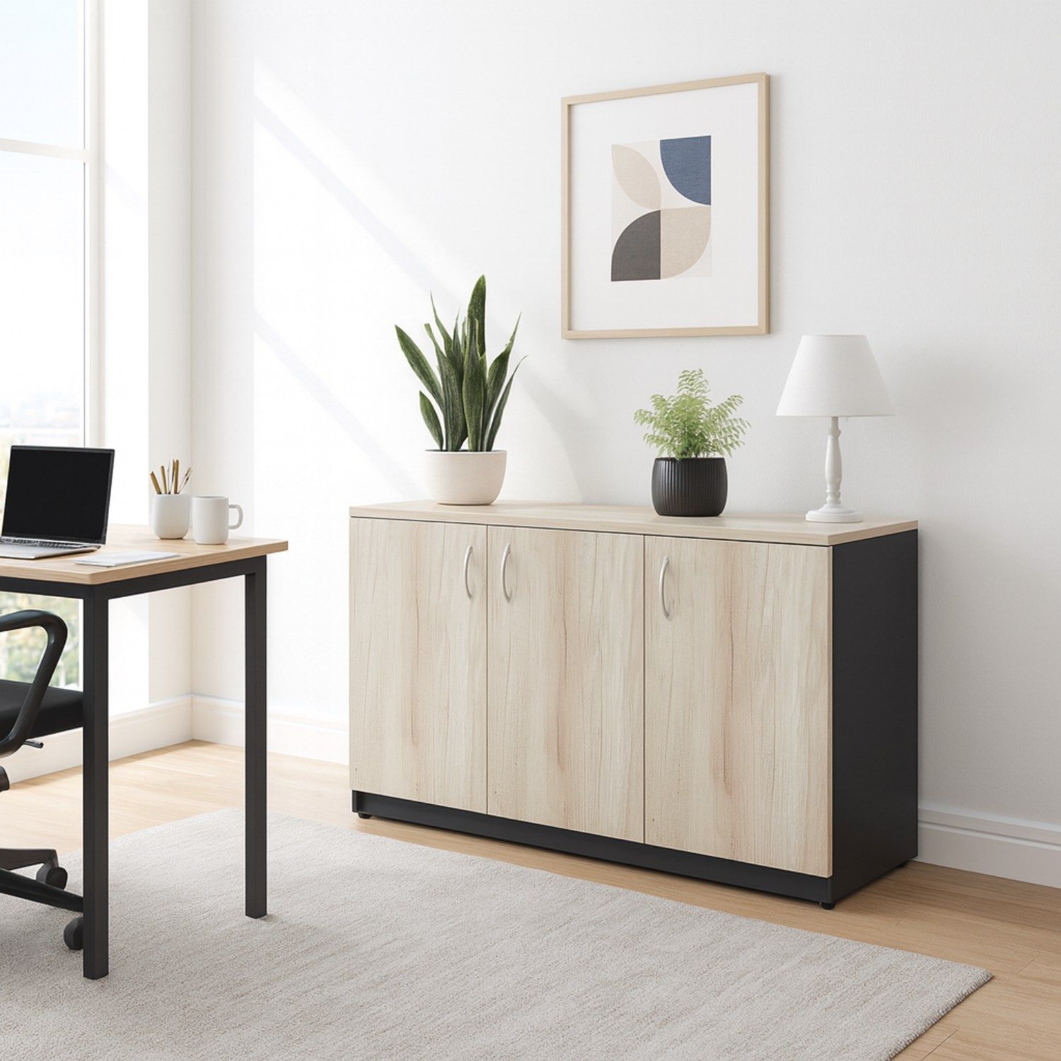 Espacio de Almacenaje Optimizado: Con tres puertas y un diseño eficiente, este gabinete ofrece un amplio espacio para almacenar documentos, materiales y otros objetos, manteniendo tu espacio organizado y libre de desorden.